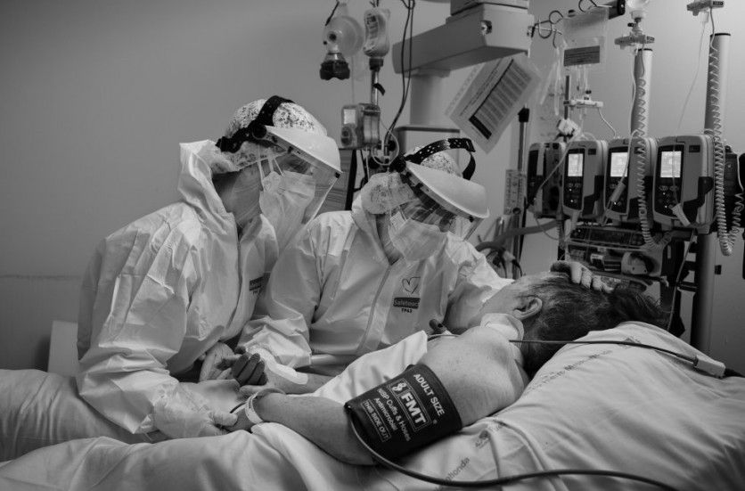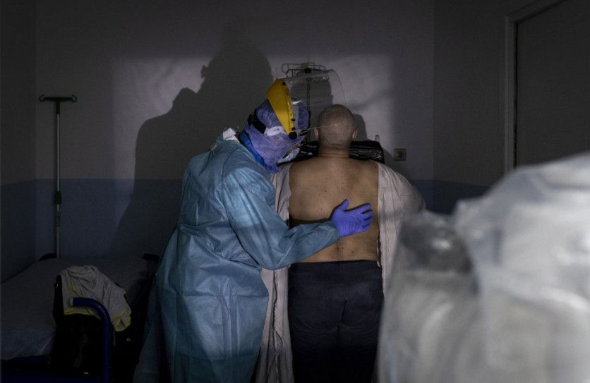 Fotografía tomada en Madrid, el 21 de diciembre 2020. En ella, una doctora y una enfermera hablan a un paciente de covid de la UCI del hospital de Puerta de Hierro para que luche por su vida. ÁLVARO YBARRA ZAVALA