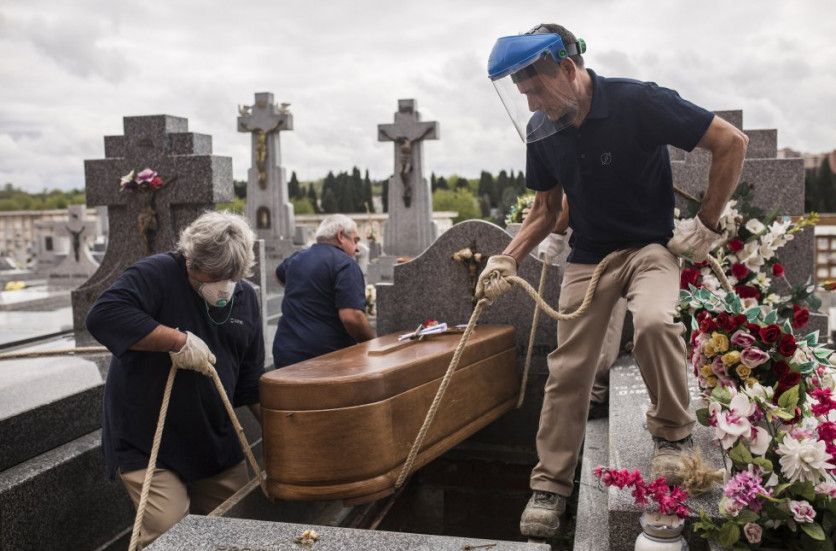 Enterradores bajan el ataúd de Manuela Revuelta en el cementerio de la Almudena, Madrid, el 7 de abril de 2020. Manuela había fallecido el 4 de abril como consencuencia del coronavirus, a la edad de 94 años en una residencia de ancianos. Los profesionales que han participado en Archivo Covid compartían su frustración por no poder dar salida en los medios a lo que estaban fotografiando. ALEJANDRO MARTÍNEZ VÉLEZ