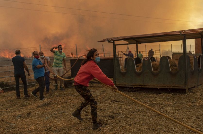 Una mujer ayuda en las tareas de extinción de un incendio cerca de una nave ganadera en Vegalatrave. Zamora, el 15 de agosto de 2020. EMILIO FRAILE