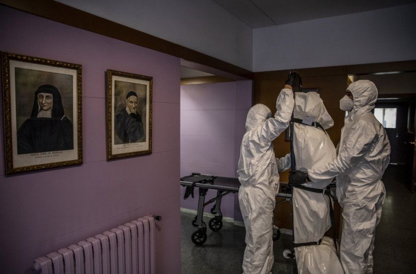 Trabajadores de la empresa de servicios funerarios Mémora retiran el cuerpo de Teodora Ros Plana, sor Ros, de 103 años, fallecida por covid-19 en el convento de Llar Verge de Gracia. Barcelona, 5 de octubre de 2020. Esta foto forma parte del reportaje: 'Éxitus'. ÀNGEL GARCÍA
