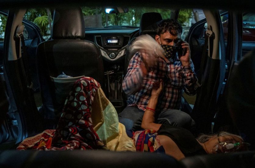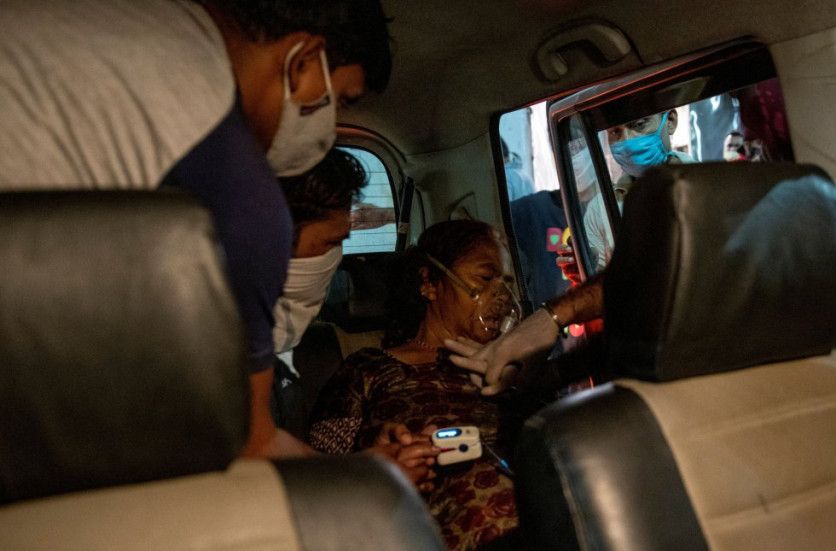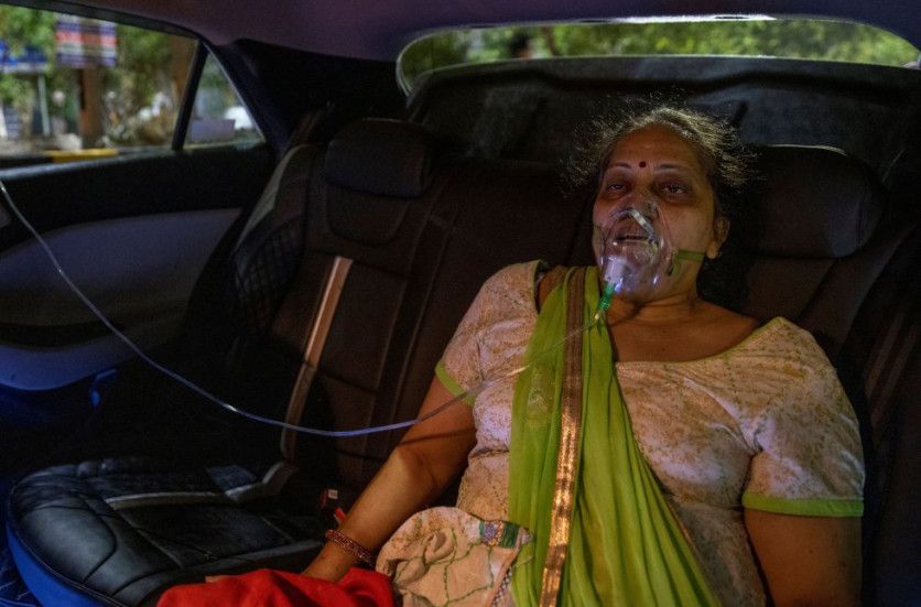 Una mujer recibe oxígeno en el interior de un coche en el exterior de un templo de Ghaziabad, este sábado. DANISH SIDDIQUI REUTERS