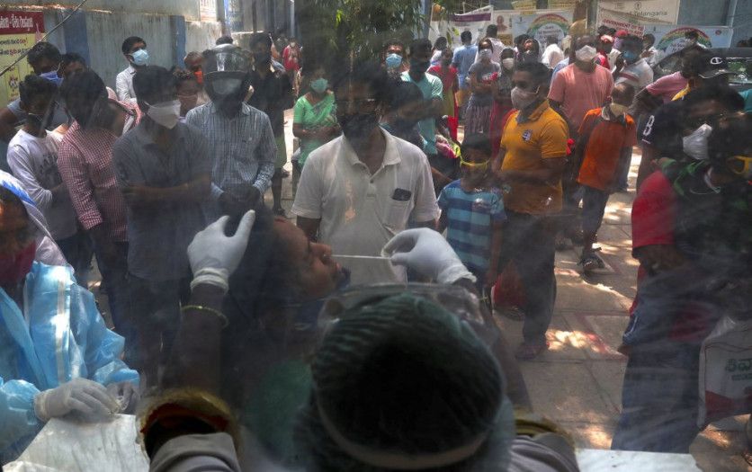 La Unión Europea está preparando una rápida ayuda a la India para atajar la creciente crisis del virus de la covid-19 que ha hecho que las infecciones y las muertes alcancen cifras récord, según ha declarado este domingo la presidenta de la Comisión Europea Ursula von der Leyen. En la imagen, personal sanitario realiza pruebas de coronavirus en Hyderabad, este domingo. MAHESH KUMAR A AP