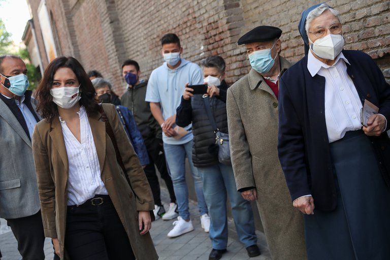 Isabel Díaz Ayuso, líder del gobierno regional de Madrid y candidata del Partido Popular (PP), pasa junto a una cola frente a un colegio electoral después de emitir su voto durante las elecciones regionales de Madrid (Reuters)