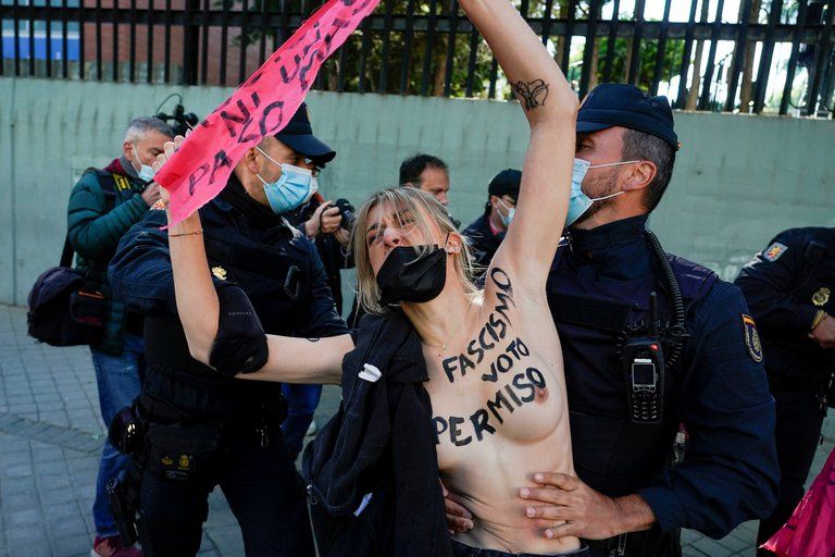 Integrantes del grupo feminista FEMEN protestan frente a la mesa electoral donde votó la candidata del partido de extrema derecha Vox, Rocío Monasterio, en Madrid (Reuters)