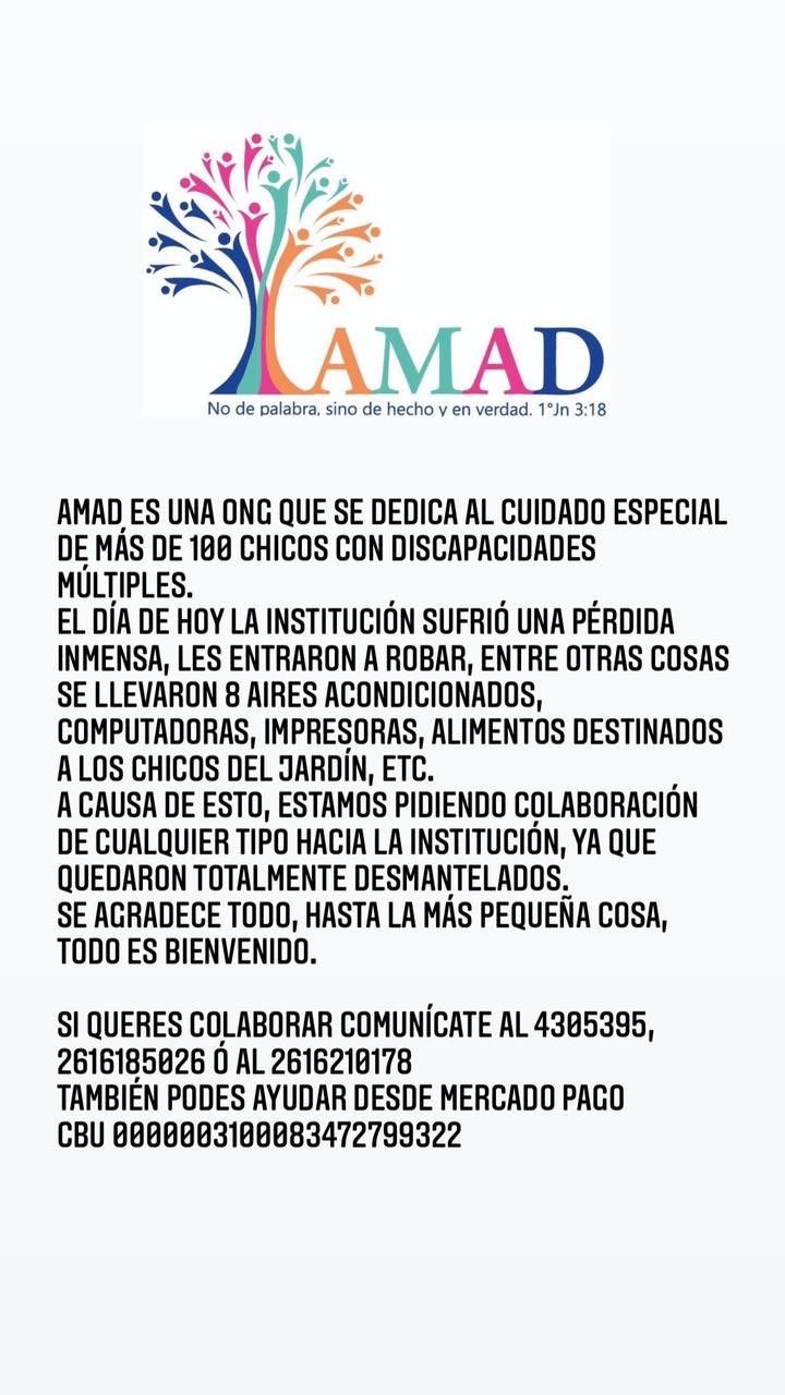 El pasado fin de semana hubo que lamentar otro hecho que no es del gusto de nadie, ya que un grupo de malhechores se hizo de un motín importante en la Asociación Mendocina de Actividades para Discapacitados (AMAD).