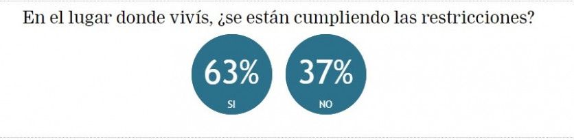 En Mendoza también se está llevando adelante esta medida y los lectores de Sitio Andino y oyentes de Radio Andina participaron de la encuesta que se llevó adelante en nuestro diario en los últimos dos días. Allí, de un universo de dos mil lectores, un total del 63 por ciento aseguraron que las medidas si se están cumpliendo en el lugar en donde viven.