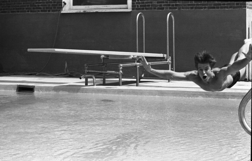 Lanzándose a la piscina del hotel Viking durante el Newport Folk Festival, en Rhode Island, 1964. Era el festival predilecto de la comunidad folk, militantes del género que no digerían bien las aventuras fuera del armazón de la canción protesta. Aquel año no aplaudieron a Dylan, que presentó un disco lleno de canciones sobre su ruptura con Suze Rotolo, 'The Another Side Of Bob Dylan'. Los críticos le acusaron tras la actuación de "haber perdido el contacto con la gente" JOHN BYRNE COOKE ESTATE