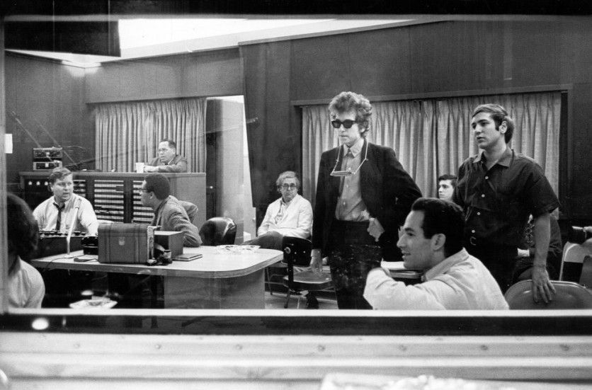 Dylan editó en un solo año, 1965, dos discos considerados obras maestras y tremendamente influyentes: 'Bringing It All Back Home' y 'Highway 61 Revisited'. Esta imagen corresponde a la grabación del segundo. Como se aprecia, en aquella época no se quitaba las gafas de sol para nada. A la derecha del cantante, sentado, con camisa blanca está Albert Grossman, su temible manager, ángel y diablo en esta historia. Grossman, del que se decía que "no distinguía una canción de una caca de perro", abrió muchas puertas al cantante y ayudó a convertirlo en una estrella. Pero acabaron en 1970 cuando Dylan descubrió que se llevaba el 50% de los derechos de algunas canciones. Más tarde fue Grossman el que denunció al músico. No era la primera vez que un artista y su representante acaban a dentelladas, pero esta fue una de las más cruentas: después de años de disputas legales, Grossman, estresado por el acoso de los implacables abogados de Dylan (según dijo luego su mujer, Sally Grossman) sufrió un ataque al corazón en 1986 y murió en pleno vuelo mientras viajaba a Londres. Tenía 59 años. Dylan siguió adelante con el juicio MICHAEL OCHS ARCHIVES