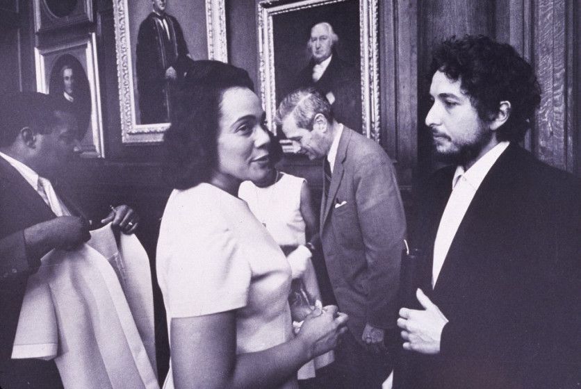 Cuando Bob Dylan ha sido entrevistado en profundidad (escasas veces) ha querido dejar claro lo poco cómodo que se siente como portavoz generacional. En 1970 asistió a la Universidad de Princeton, en Nueva Jersey, para recibir un premio honorífico. También se galardonó a la viuda de Martin Luther King, Coretta Scott King (ambos en la foto). En su libro 'Crónicas', el músico cuenta que se enfadó mucho cuando fue presentado en esa gala como "la expresión auténtica de la conciencia perturbadora y preocupada de la joven América". NEW YORK TIMES CO.