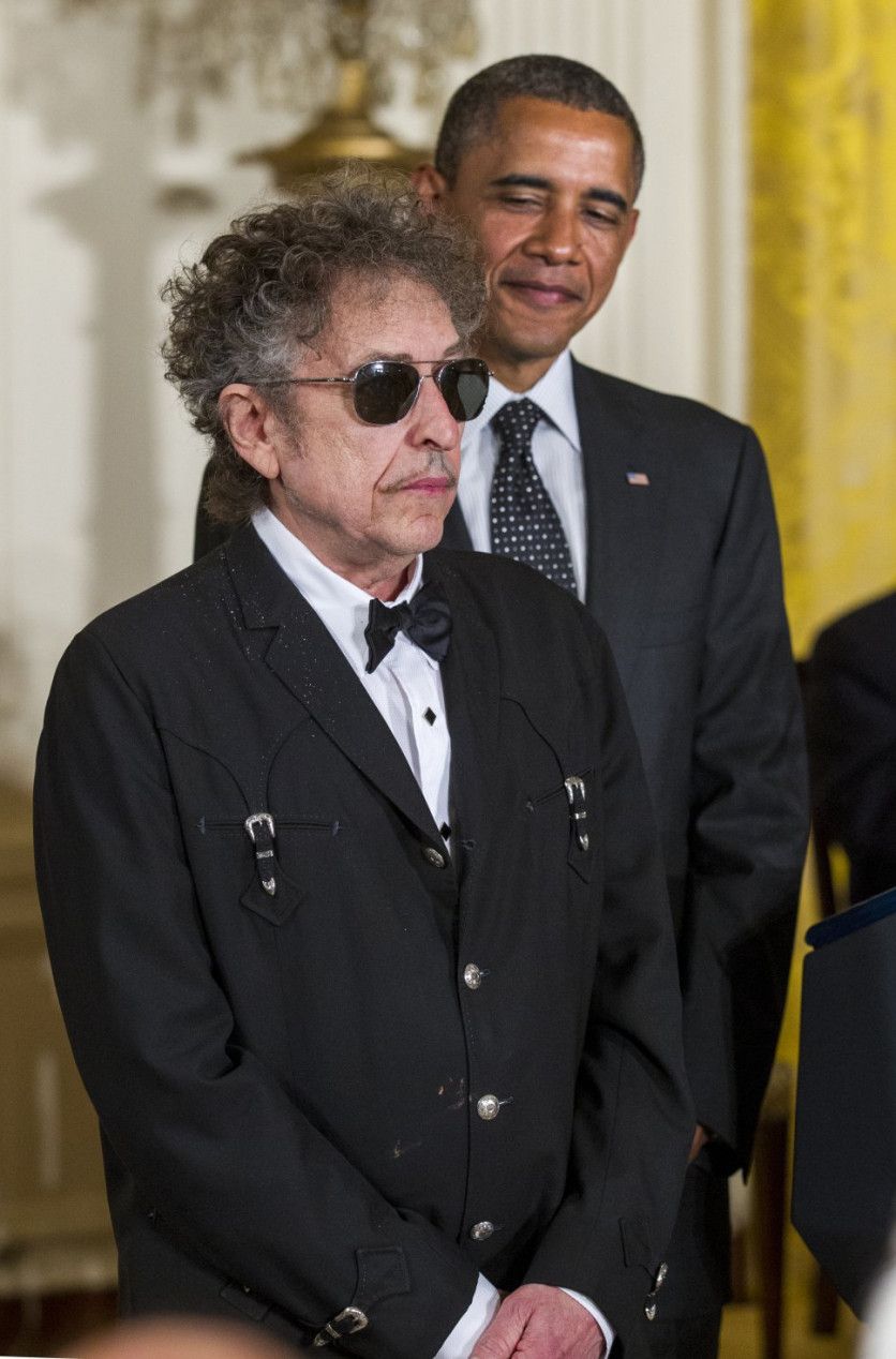 Con otro presidente demócrata, Barack Obama, recibiendo la Medalla Presidencial de la Libertad en 2012. Obama observa orgullo a Dylan, que adopta su pose de efigie con gafas de sol. BROOKS KRAFT