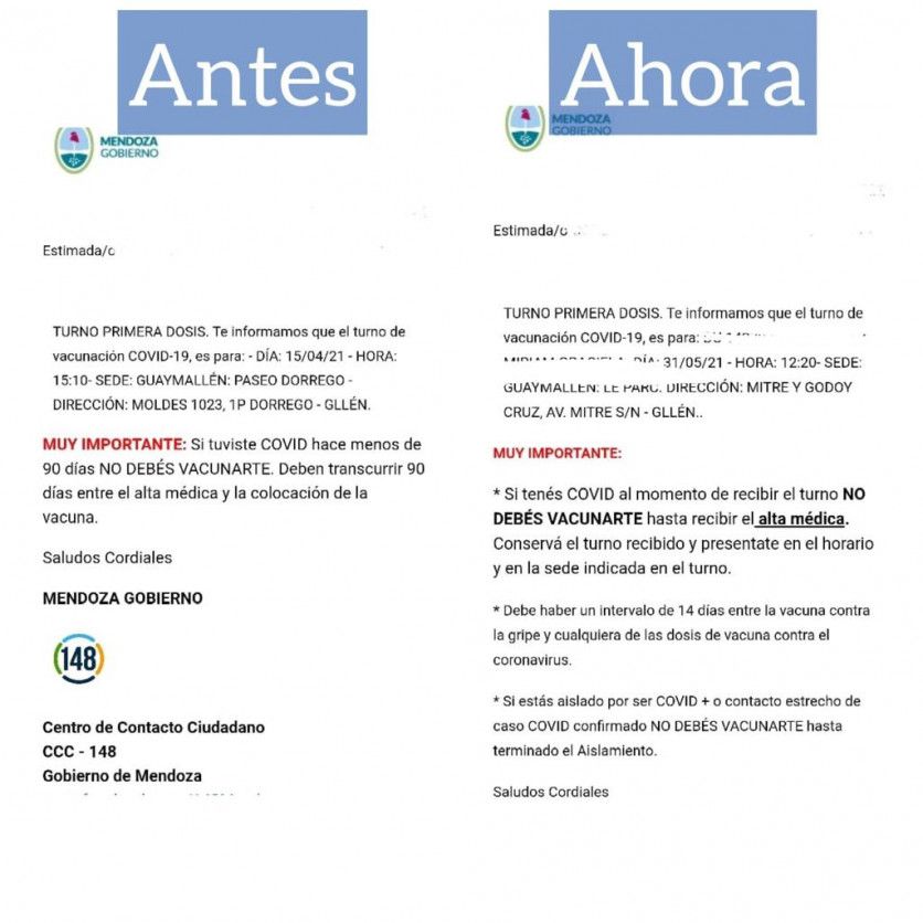 En que hasta hace algunos días, cuando una persona recibía su turno para aplicarse la inoculación, recibía también la aclaratoria de que en caso de haber contraído el virus debería esperar un período de 90 días desde que se recibió el alta médica y la colocación de la vacuna. Por lo que en esos casos los turnos serían reprogramados.