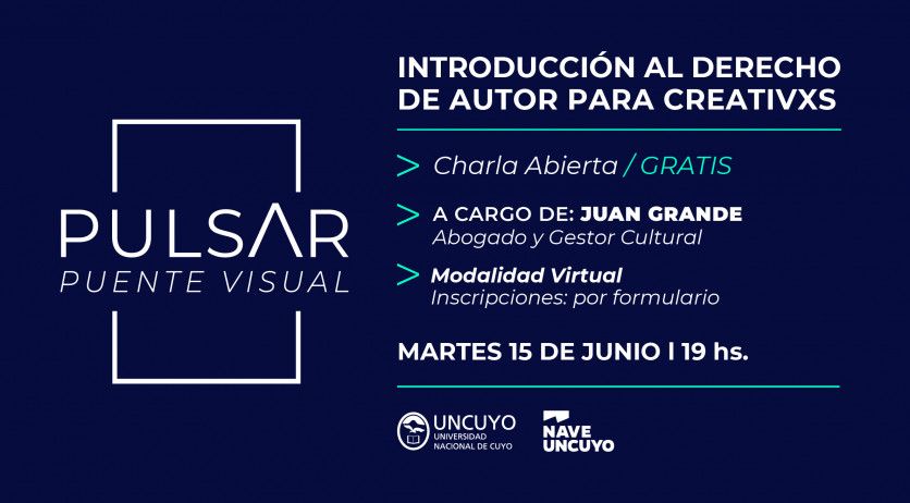 La plataforma de visualización y profesionalización de Artistas Visuales PULSAR, originada desde el área de extensión de la Universidad Nacional de Cuyo ofrecerá este mes una charla abierta sobre "Introducción al Derecho de Autor".