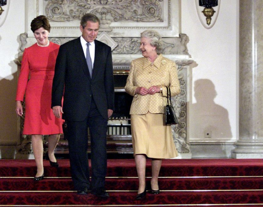 George Bush y su esposa Laura, con la reina de Inglaterra, al término de su visita al palacio de Buckingham en julio de 2001. El momento más recordado de George W. Bush con la reina Isabel es probablemente su error durante su visita real a la Casa Blanca en 2007, cuando dijo en su discurso que la monarca había cenado con diez presidentes de Estados Unidos y que había ayudado al país a "celebrar su bicentenario en 1700". Rápidamente lo corrigió y dijo, "perdón, 1976". J. SCOTT APPLEWHITE AP