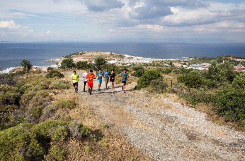 Nina de Winter, holandesa de 26 años y codirectora de la ONG Yoga y Deporte con Refugiados, junto con el equipo de corredores, compuesto principalmente por afganos, en las montañas de Mitilene, en la isla de Lesbos. Al fondo, el campamento de Mavrovouni, el único activo en la isla, en el que viven los emigrantes en busca de refugio. GIACOMO SINI