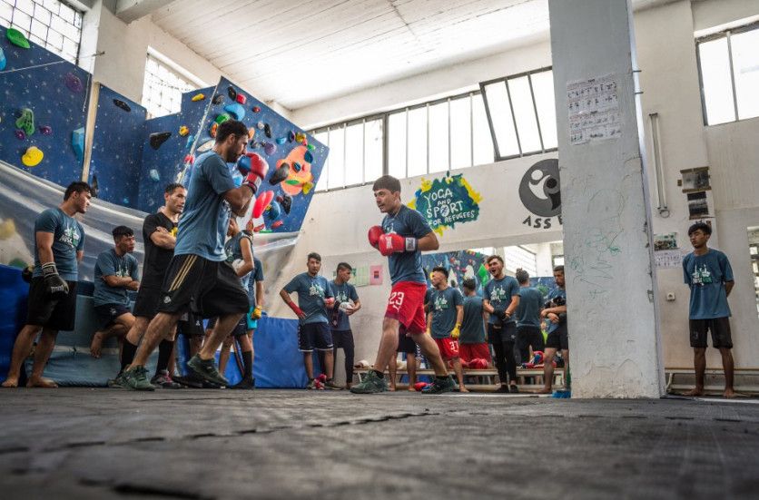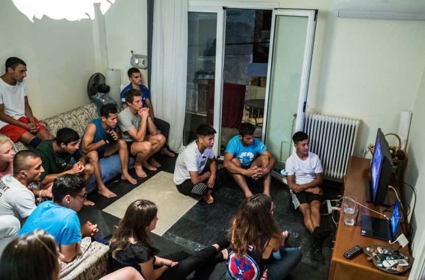 El equipo Team Energy de la asociación Yoga y Deporte con Refugiados sigue junto con un grupo de voluntarios los combates internacionales de muay thai de sus amigos afganos Majid y Hamid, ambos miembros activos de la asociación y del equipo en Atenas. GIACOMO SINI
