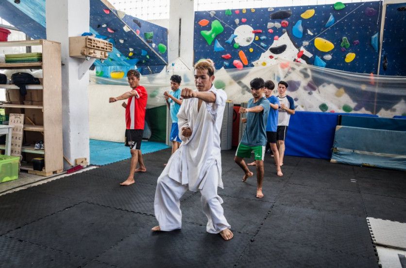 El joven afgano Nasim Ahmadi, instructor de kárate de la ONG, durante la clase que da por la mañana en su gimnasio. Ahmadi lleva cuatro años practicando kárate. GIACOMO SINI