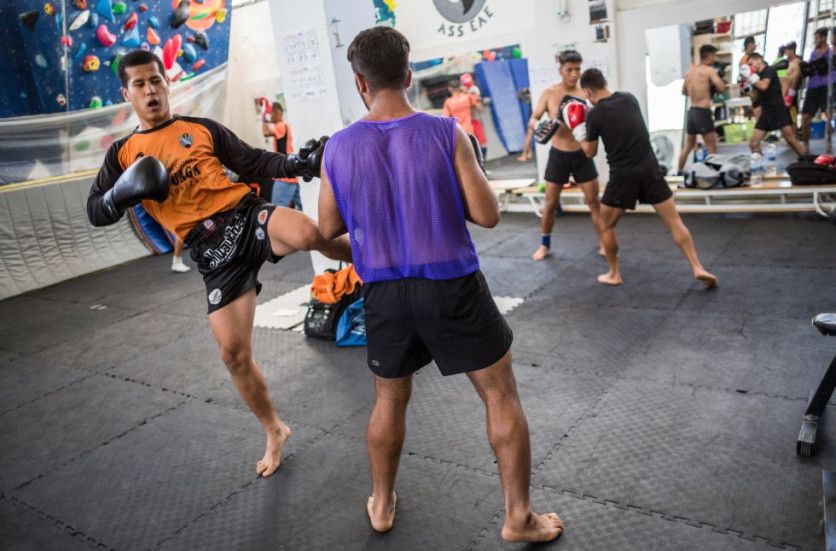 Mahdi Khavari, afgano de 18 años, enseña cada tarde muay thai en el gimnasio de la asociación. En la foto, dando una patada durante la sesión de 'sparring' del entrenamiento. GIACOMO SINI