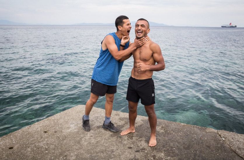 Mahdi y Nasrlallah, miembros del Energy Team de K1/kick boxing y muay thai de la asociación Yoga y Deporte con Refugiados, se relajan junto al mar después de sus ejercicios en el gimnasio cerca de Mitilene, en la isla de Lesbos. GIACOMO SINI