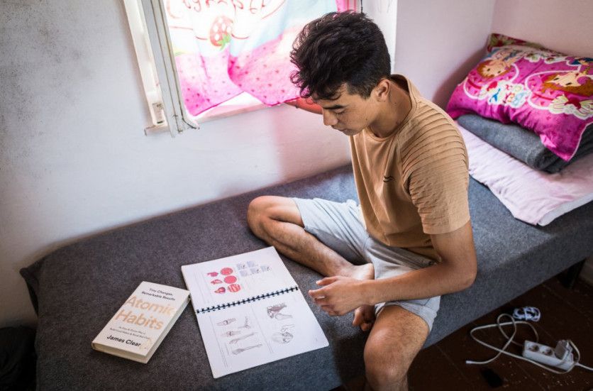 Zakhi, un joven afgano de 20 años, profesor de yoga de la ONG, en su habitación de Mitilene, en la isla de Lesbos, leyendo libros sobre la disciplina. Zakhi vive con otros instructores en una vivienda alquilada. GIACOMO SINI