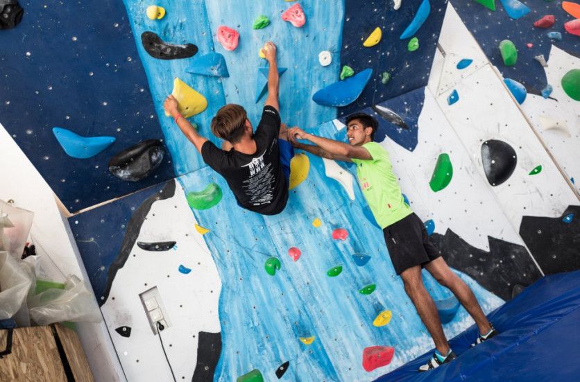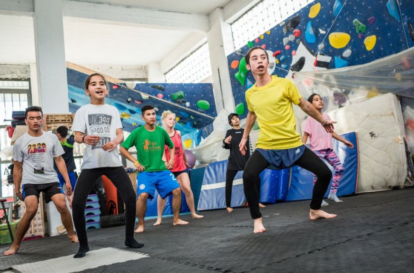 Nabiuallah, un joven voluntario ayuda a un alumno en el curso de escalada en el gimnasio de la ONG. Nabiuallah es un refugiado afgano que actualmente vive en Mavrovouni, el único campamento de refugiados activo en la isla de Lesbos. GIACOMO SINI