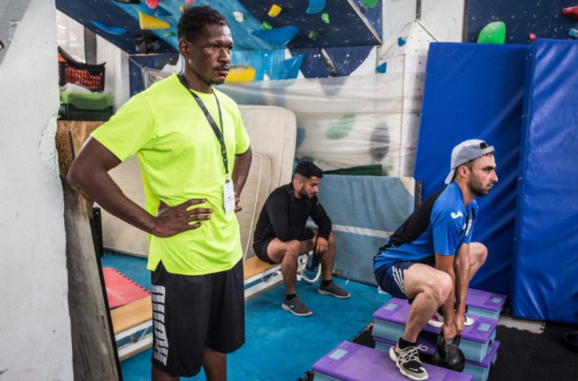 Aziz, un refugiado congoleño de 24 años, profesor de culturismo y fitness de Yoga y Deporte con Refugiados, observa atentamente los movimientos de sus alumnos en el gimnasio. GIACOMO SINI