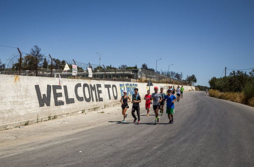 El equipo de corredores de la ONG Yoga y Deporte con Refugiados pasa corriendo junto al muro del antiguo campamento de refugiados de Moria, cerrado después del incendio de 2020. Muchos de los corredores del equipo vivían en él antes de que los trasladaran al campamento de Mavrovouni, el único activo actualmente en la isla de Lesbos. GIACOMO SINI