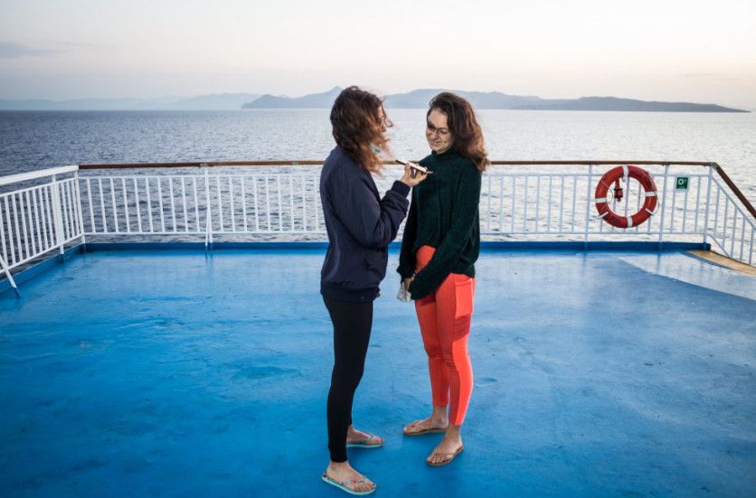 Estelle Jean y Nina de Winter en el barco Nissos Rhodos que enlaza Pireo con Mitilene. Las dos jóvenes dirigen la ONG Yoga y Deporte con Refugiados en Atenas y Lesbos. Jean y Winter hacen este trayecto cada mes para coordinar mejor las actividades de la ONG. GIACOMO SINI
