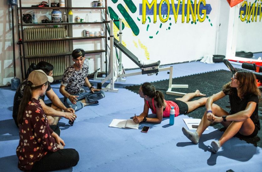 Sohalia, Alí y Aref, los jóvenes refugiados afganos coordinadores de las actividades de Yoga y Deporte con Refugiados en Atenas, en el gimnasio de la ONG en la capital griega durante una reunión con Jean y Winter para organizar el trabajo de las siguientes semanas. GIACOMO SINI
