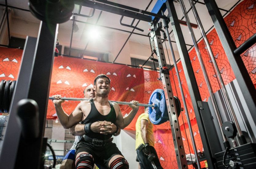Alí es un refugiado afgano de 25 años apasionado del culturismo. Es el coordinador en Atenas de la ONG Yoga y Deporte con Refugiados y el director del gimnasio de la organización en la capital griega. Aquí aparece levantando pesas. GIACOMO SINI