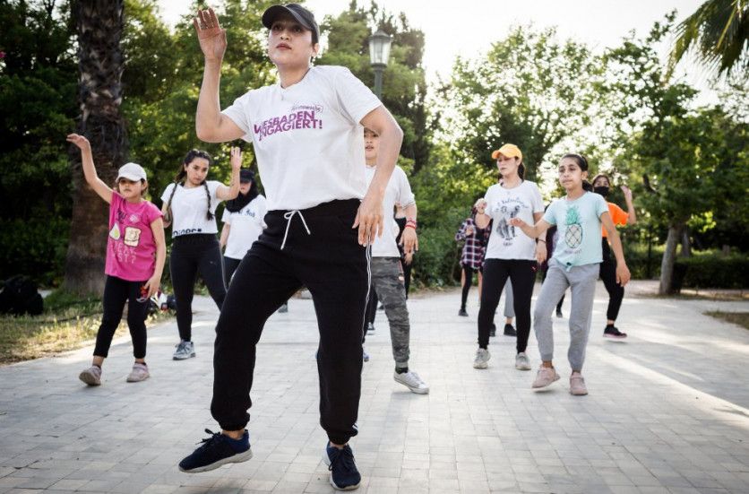 Nasrin Soltani, una joven afgana profesora de zumba en Atenas con la ONG Yoga y Deporte con Refugiados, durante una de las sesiones organizadas por ella en el céntrico parque dedicado a Ares en la capital griega. GIACOMO SINI
