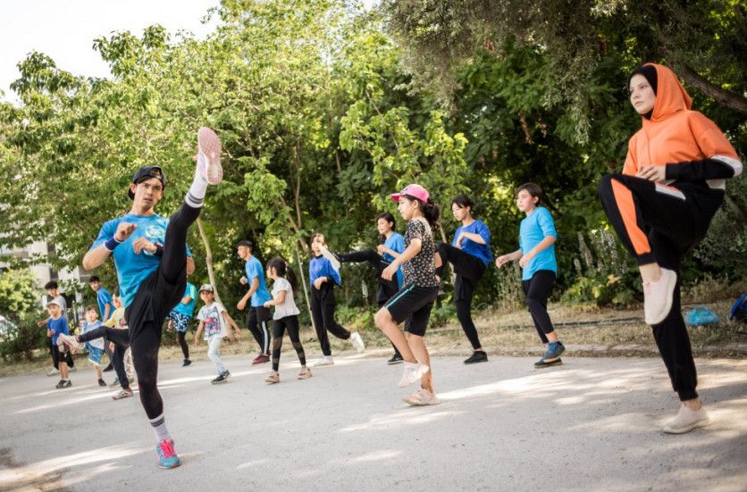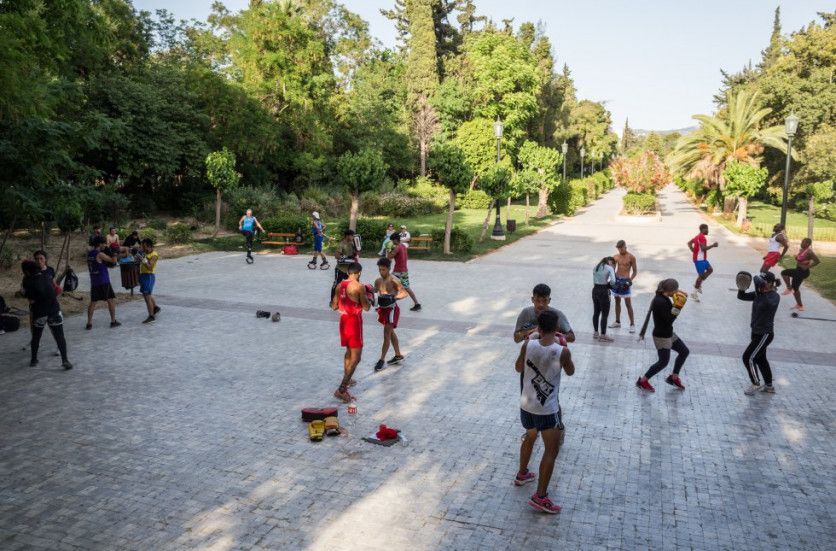El curso de K1/kickboxing de la sección ateniense del Energy Team organizado por la ONG Yoga y Deporte con Refugiados en una plaza del parque dedicado a Ares del centro de la capital griega. Unos 30 chicos y chicas participan en él cada día. GIACOMO SINI