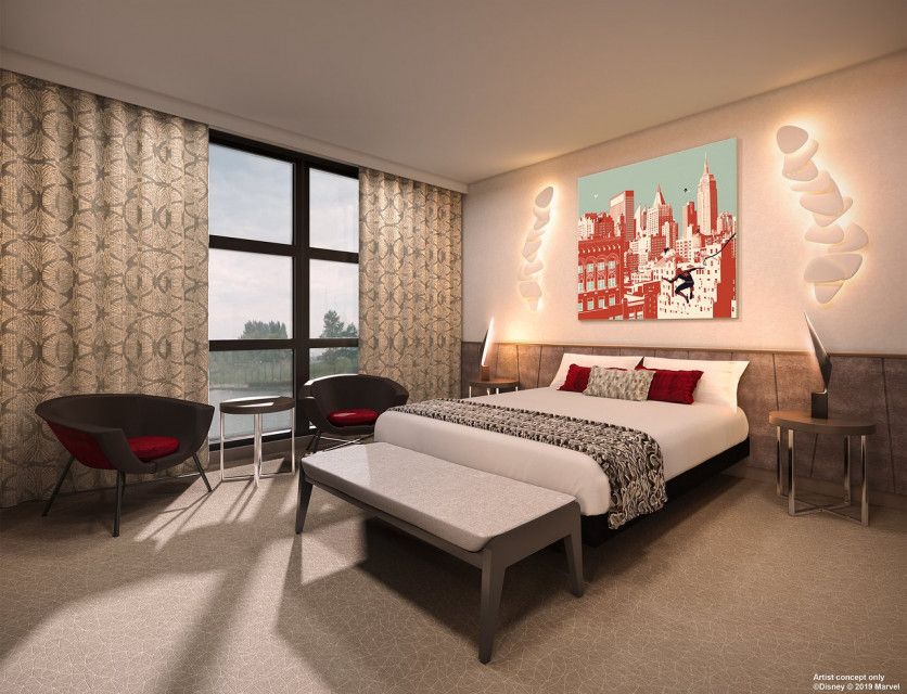 Habitaciones Empire State Club. Adaptadas para huéspedes de movilidad reducida, su diseño contemporáneo neoyorkino con un toque de Tony Stark, cuenta con una selección de obras Marvel cuidadosamente seleccionadas.