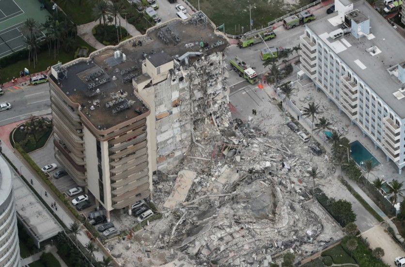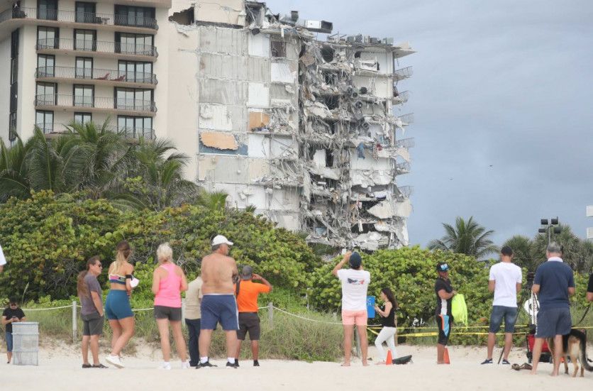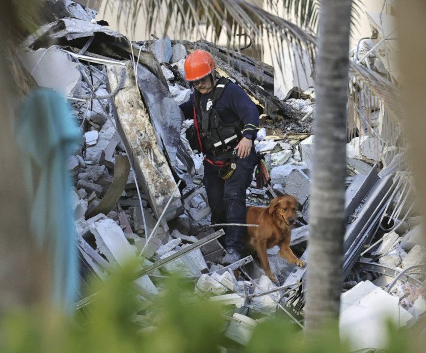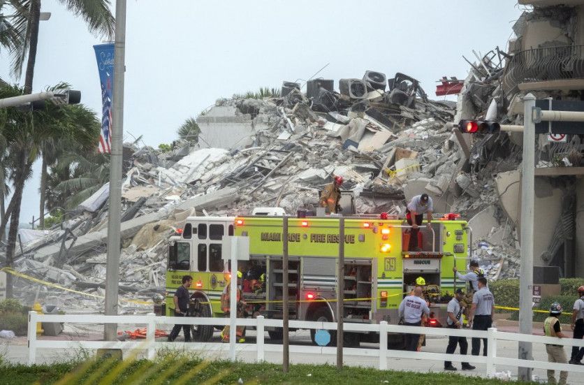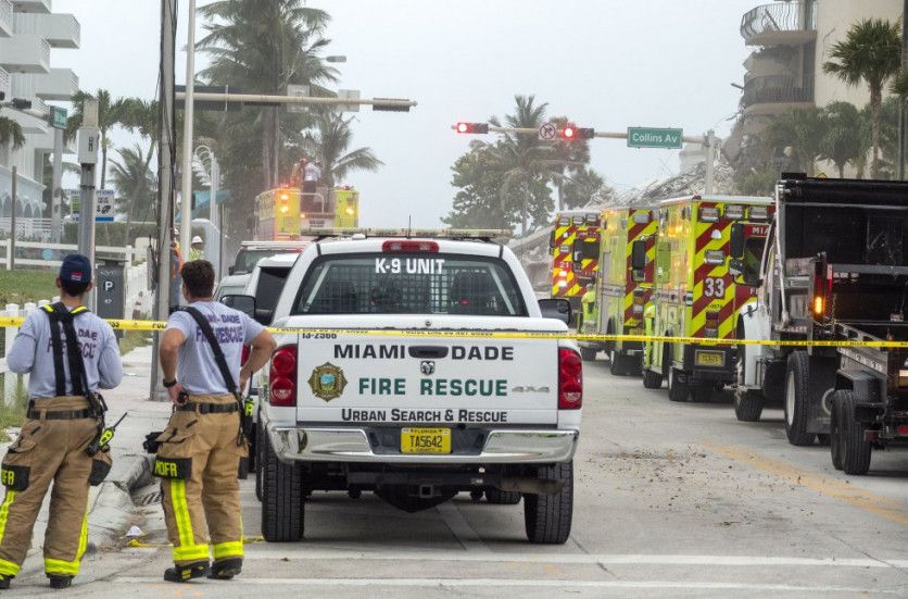 Varios equipos de rescate de Miami-Dade buscando a los posibles supervivientes en el colapso parcial de un edificio de 12 pisos en Surfside. El suceso se ha producido entre la calle 88 y la avenida Collins, en la localidad de Surfside, a unos nueve kilómetros de Miami Beach, en la línea de costa.