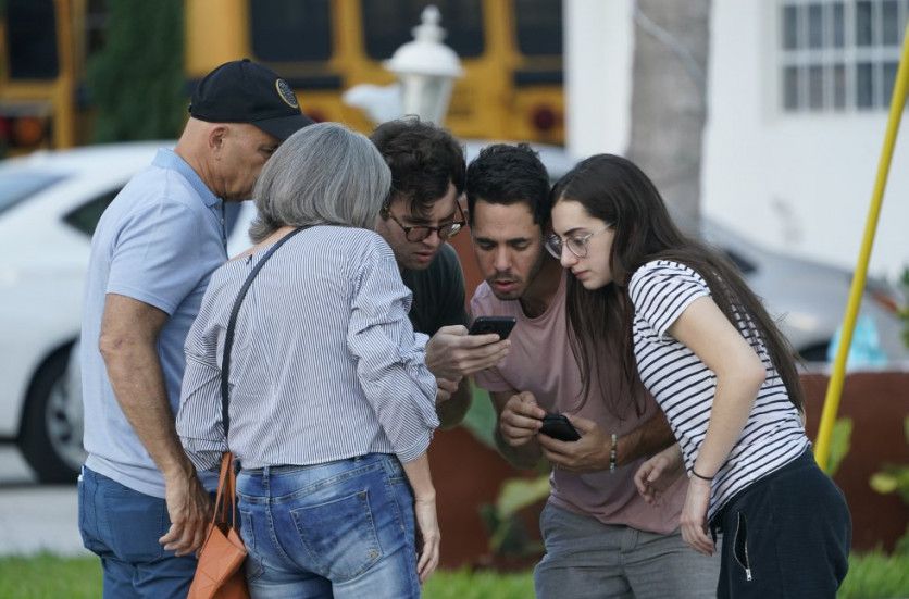 Un grupo de personas consulta un teléfono móvil en busca de información adicional sobre el derrumbe, este jueves en Surfside. Los bomberos han logrado sacar con vida a un chico de entre los escombros, según se puede ver en las imágenes de la cadena local de televisión NBC6. Uno de los bomberos lo ha sacado a hombros y le han tumbado en una camilla de rescate.