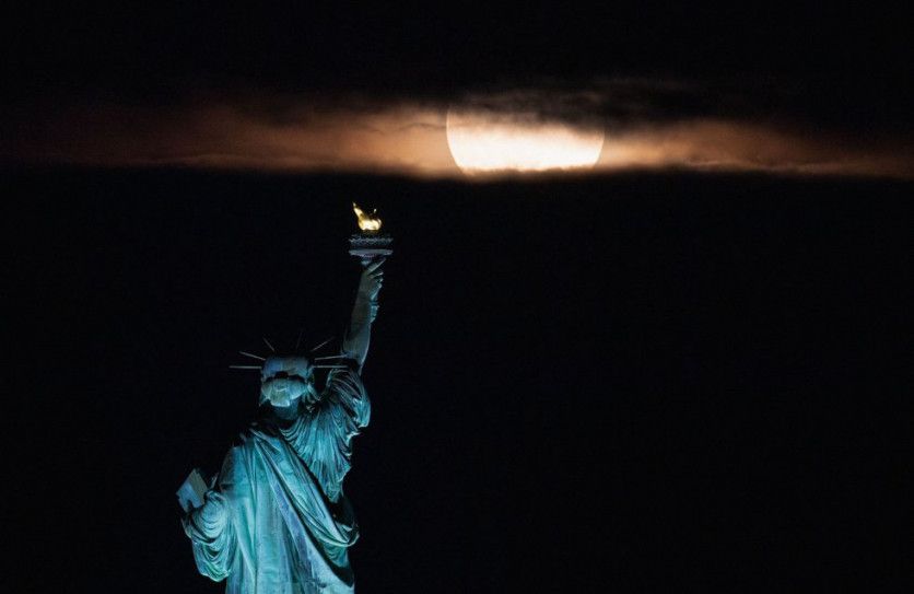 La luna rosada se eleva detrás de la estatua de la Libertad en la ciudad de Nueva York (EE UU). ANGELA WEISS AFP