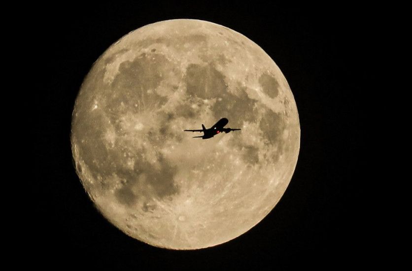 La silueta de un avión aparece junto a la superluna en la ciudad de Moscú (Rusia). SERGEI ILNITSKY EFE