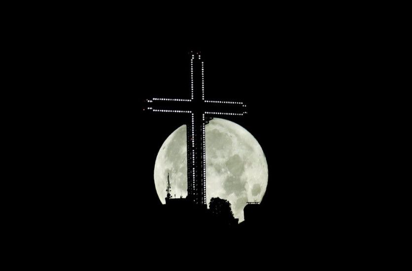 La Luna de fresa, detrás de la cruz del Milenio sobre Skopje (Macedonia del Norte). OGNEN TEOFILOVSKI REUTERS