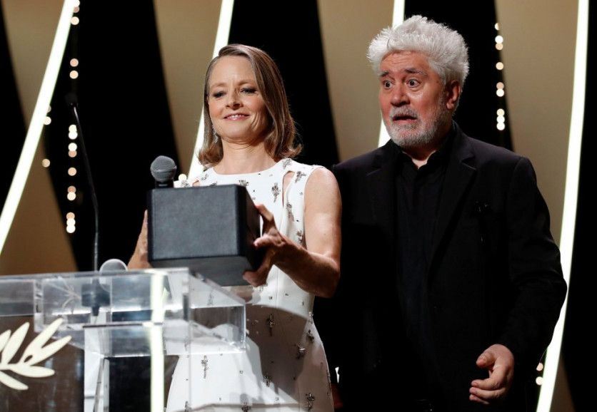Jodie Foster tras recibir de manos de Pedro Almodóvar la Palma de Oro de Honor durante la ceremonia de inauguración de la 74ª edición del Festival de Cannes, este martes. GONZALO FUENTES REUTERS