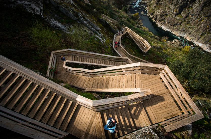 Pasarelas del Paiva (Portugal) La salvaje zona montañosa del norte de Portugal sería prácticamente inaccesible si no fuera por los Passadiços do Paiva . Estas pasarelas de madera recorren a lo largo de ocho kilómetros el curso del río Paiva, bordeando montañas y salvando importantes desniveles. Para completar la ruta se requieren varias horas y cierta forma física, sin olvidar de llevar agua suficiente. Están en el municipio de Arouca, en el distrito portugués de Aveiro, y son además un santuario natural de varias especies en peligro. Su recorrido es un viaje por la arqueología, la biología y la geología de esta región al sur de Oporto. SOPA GETTY