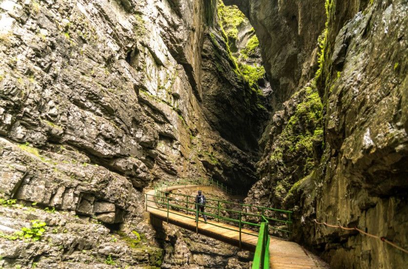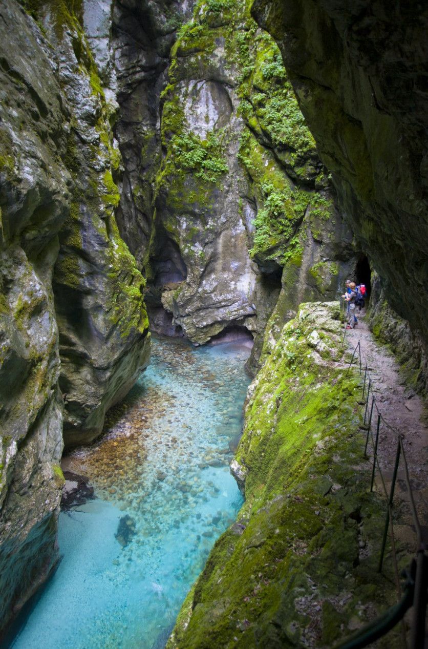 Garganta de Tolmin (Eslovenia) El acceso al cañón de Tolmin es también la entrada al famoso parque nacional del Triglav, una zona estupenda para el senderismo. Si en este angosto desfiladero -cuyas paredes en algunos puntos no distan sino pocos metros- murmura el agua azul urquesa del Tolminka, en los abruptos acantilados predomina un verde extraordinariamente frondoso e intenso. Hay diversas pasarelas de madera y unas cuantas escaleras. También todo un sistema de cavernas, entre ellas la cueva de Zadlaska, o gruta de Dante. El punto culminante es un manantial de aguas termales que invita al relax ALDO PAVAN GETTY