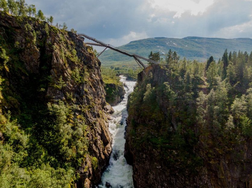 Voringsfossen (Noruega) El agua de los Alpes escandinavos cae con un enorme estruendo y una fuerza indómita por esta imponente cascada de casi 200 metros. Para llegar hasta ella, el agua primero debe atravesarse el valle calizo de Måbødalen, toda una experiencia: se baja por 1.300 peldaños de piedra, por gravilla suelta y por un exiguo puente colgante de madera que cruza el arroyo. Voringsfossen es una de las muchas cascadas que existen en los fiordos noruegos, y probablemente, la más famosa. Desde hace un año, cuenta además con un espectacular puente de acero anclado a la roca (en la imagen), una atracción turística solo apta para valientes, que permite pasear a 150 metros de altura sobre el salto, por una pasarela que parece flotar en el aire. STIAN LYSBERG SOLUM GETTY