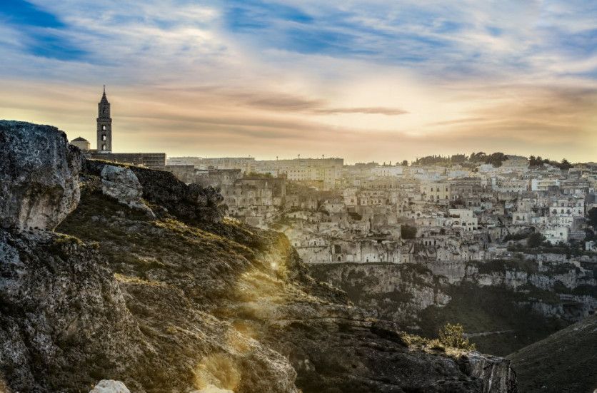 La Gravina de Matera (Italia) Se dice que Matera es uno de los asentamientos más antiguos del mundo. Y es muy posible. La prueba está en esta garganta que llaman La Gravina horadada por multitud de cuevas -las Sassi di Matera- que ya estaban habitadas hace 7.000 años. Hoy, sobre la roca y con fabulosas vistas, se levantan lujosos alojamientos, pero las antiguas viviendas trogloditas siguen siendo un lugar abierto a todos. WESTEND61 GETTY