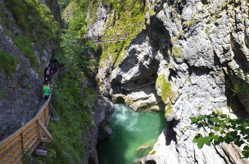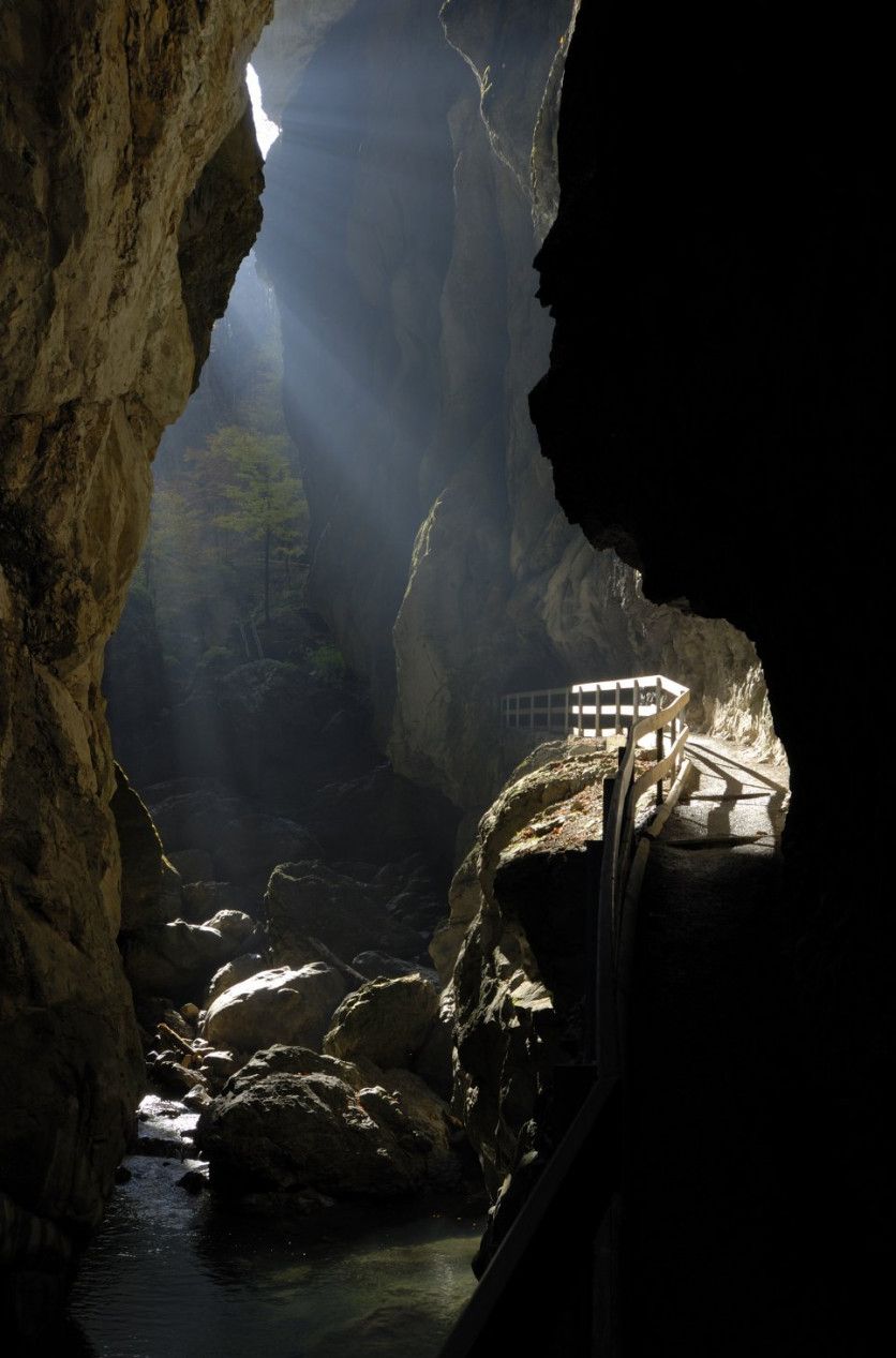Garganta del Lammer (Austria) Unos 40 kilómetros al sur de Salzburgo, las aguas procedentes de los glaciares han horadado una imponente garganta en la piedra: Lammerklamm. Se siente nítidamente la fuerza indómita de la naturaleza cuando, desde la pasarela, se baja al puente sobre la corriente atronadora. En la parte más angosta y oscura, las paredes de la quebrada están separadas solo por unos pocos metros. Toda la región es una popular zona de vacaciones con prados y bosques y muchísimas casas rurales, perfecta para amantes del excursionismo. WOLFGANG WEINHAEUPL GETTY