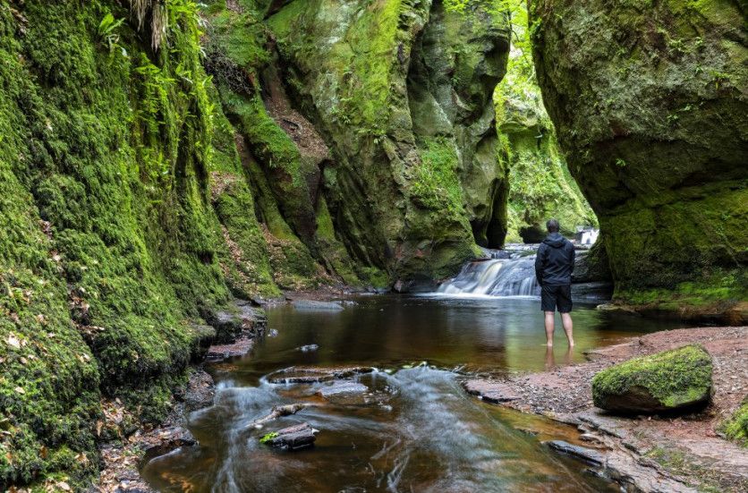 Finnich Glen (Escocia) Árboles de hoja caduca y arbustos que se agarran desesperadamente a la escarpada roca. Si miras hacia arriba, entre los húmedos acantilados no ves más que una exigua franja de cielo azul. Y es que esta cañada de Finnich (Finnich Glen), junto al lago Lomond, en Escocia, es un lugar mágico, especialmente en los rincones adonde llegan los rayos del sol iluminando la angosta quebrada con un halo de misterio. Es aquí, en Finnich Glen, donde se encuentra el llamado Púlpito del Diablo. Según la leyenda, en este altar de roca se reunían en secreto los druidas celtas. Está a solo unos 30 minutos de Glasgow, pero parece otro mundo. WESTEND61 GETTY