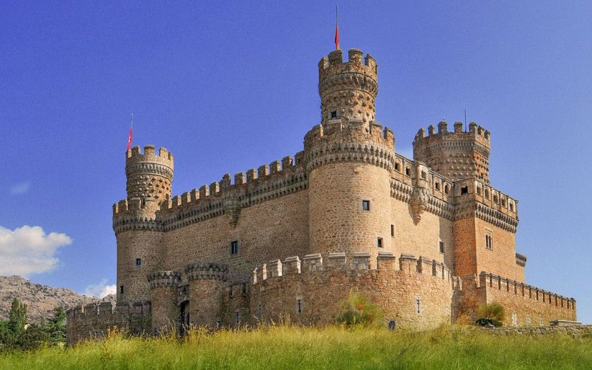 Castillo Manzanares el Real (Madrid). Palacio-fortaleza del siglo XV de planta cuadrangular con cuatro imponentes torres (tres circulares y la del homenaje que es octogonal). Su patio interior está porticado.