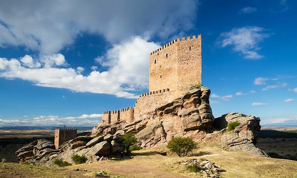 Castillo de Zafra (Guadalajara). Claro ejemplo de castillo roquero que sobresale por su emplazamiento en una zona de escarpada orografía en el que destaca la torre del homenaje edificada sobre lo alto del farallón rocos.