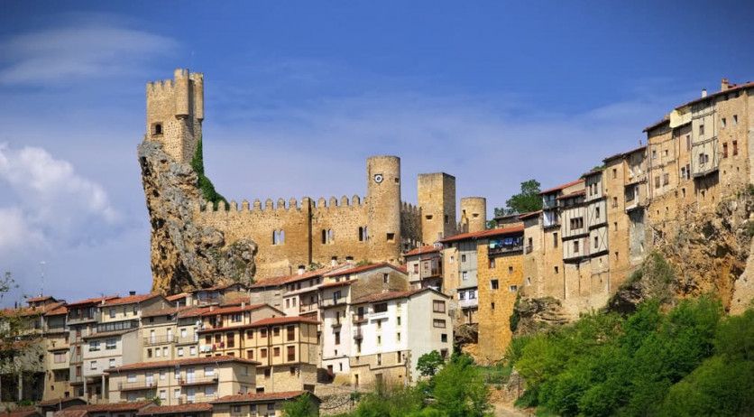 Castillo de Frías (Burgos). Desde su privilegiada situación controla el valle de Tobalina y el paso del río Ebro mediante el puente, también fortificado, que se sitúa a sus pies. Esta es una de las rutas principales que han unido, historialmente, la meseta castellana con la cornisa cantábrica.