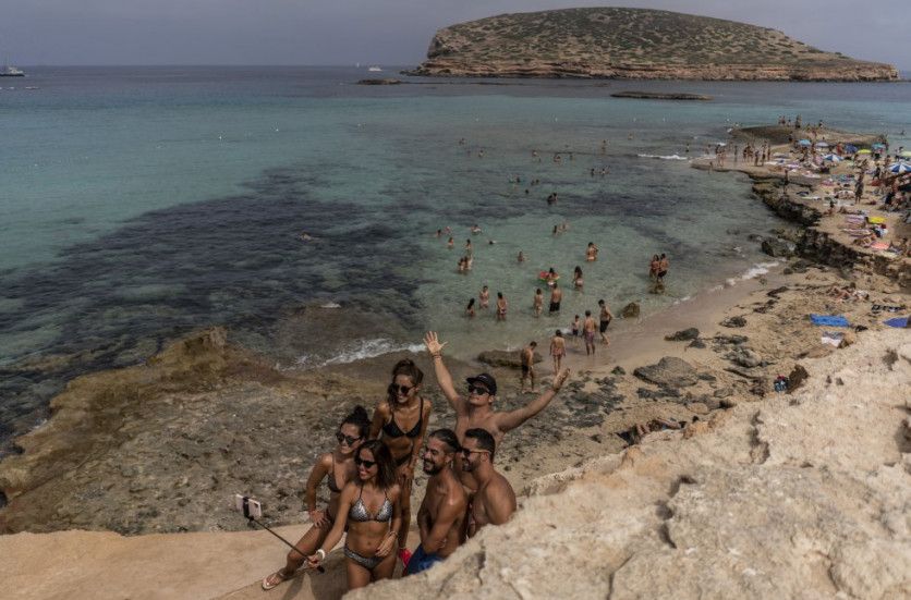 Un grupo de amigos se fotografían en la cala Comte de Ibiza. OLMO CALVO