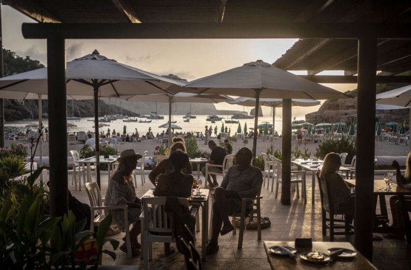 Varias personas en la terraza del bar Roca y Mar, en la cala Benirrás de Ibiza. OLMO CALVO