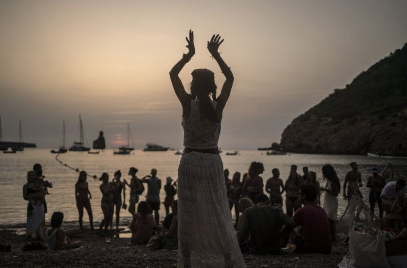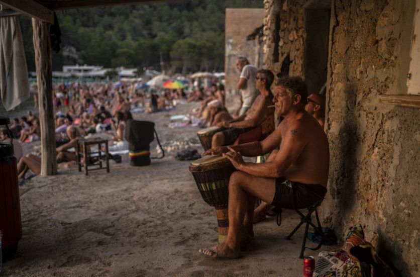 Varios hombres tocan tambores al atardecer en la cala Benirrás de Ibiza. OLMO CALVO